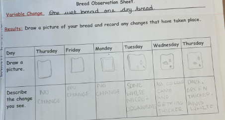 Over the week, Year 6 checked the bread daily, making detailed observations. They drew what the bread looked like on different days, wrote brief descriptions of the changes they noticed, and recorded questions that arose during the investigation in their science books. Year 6 discovered that mould grew on the damp bread but not on the dry bread, helping them to understand that moisture is an important condition for mould growth.