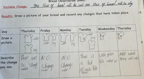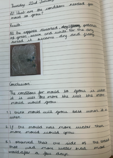 Over the week, Year 6 checked the bread daily, making detailed observations. They drew what the bread looked like on different days, wrote brief descriptions of the changes they noticed, and recorded questions that arose during the investigation in their science books. Year 6 discovered that mould grew on the damp bread but not on the dry bread, helping them to understand that moisture is an important condition for mould growth.